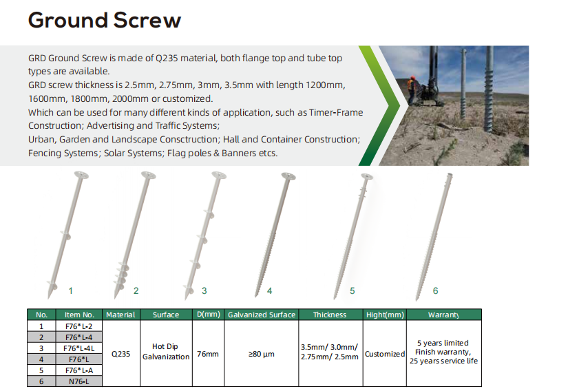 برغي أرضي الأساسات: تُستخدم هذه القاعدة لتثبيت ودعم حوامل الألواح الكهروضوئية. توفر هذه القاعدة دعمًا ثابتًا لها عن طريق تثبيت ركائز معدنية حلزونية في الأرض. تتميز أساسات اللولب الأرضي بسرعة تركيبها وتأثيرها البيئي المنخفض. يتكون هيكلها بشكل أساسي من هيكل لولبي أرضي ومكونات ربط. هيكل الركيزة حلزوني مع شفرات حلزونية في نهايته، مما يساعد على توفير الالتصاق والثبات عند تثبيتها في الأرض.